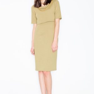 Figl Oliwkowa Elegancka Midi Sukienka z Biżuteryjnym Łańcuszkiem