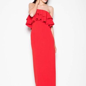Venaton Czerwona Sukienka Długa Elegancka z Falbankami