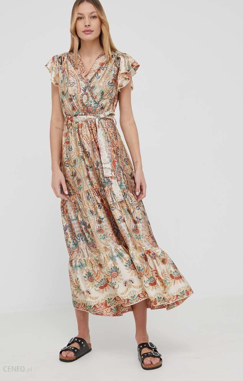 – Rozkloszowany fason.- Krótki rękaw.- Zakładany dekolt.- W pasie wąska, elastyczna listwa.- W talii pasek.- Model z ozdobnymi falbanami.- Cienka, nieelastyczna tkanina.- Długość:- Szerokość pod pachami:- Wymiary podane dla rozmiaru: