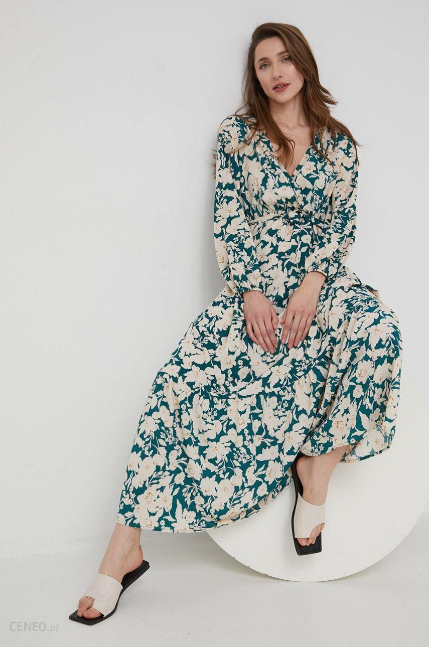 – Spiczasty dekolt.- Długi rękaw.- Elastyczna listwa w pasie.- W talii pasek.- Ozdobne marszczenia.- Wzorzysta tkanina.- Długość rękawa: 58 cm.- Długość: 145 cm.- Szerokość pod pachami: 49 cm.- Wymiary podane dla rozmiaru: S.