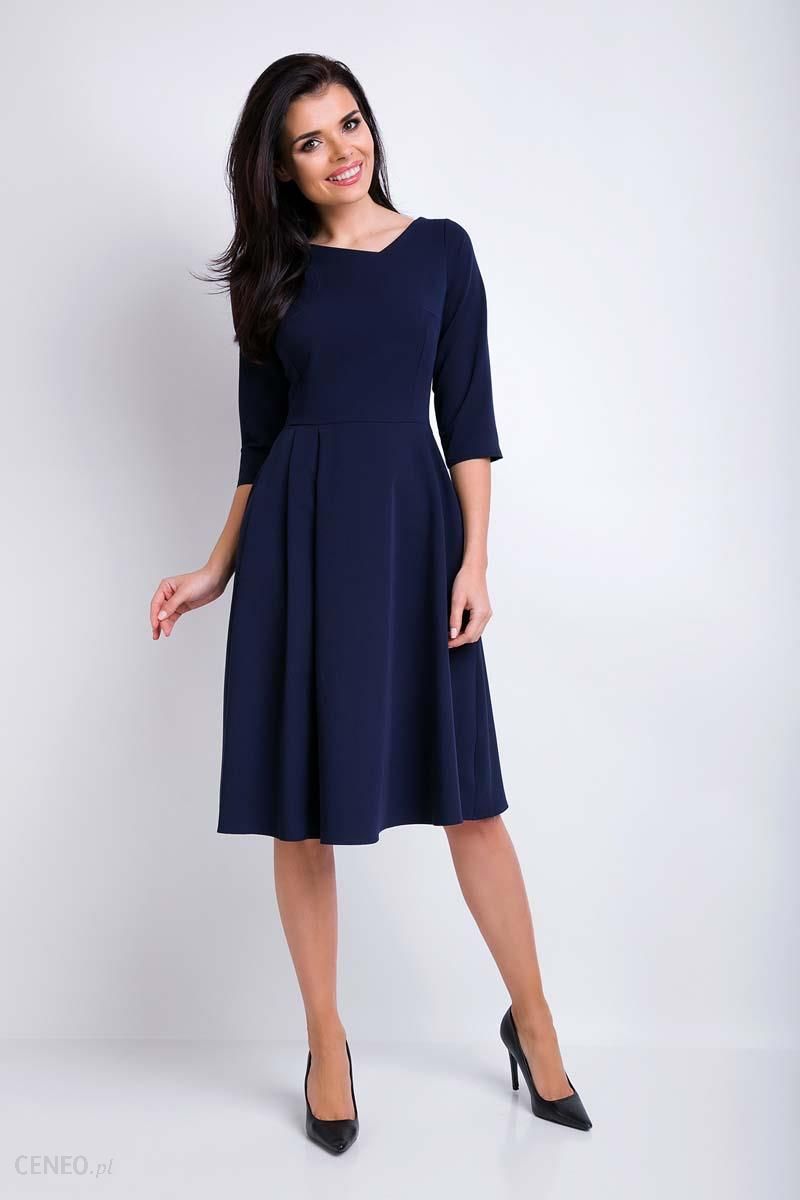 Awama Granatowa Sukienka Rozkloszowana Midi z Asymetrycznym Dekoltem