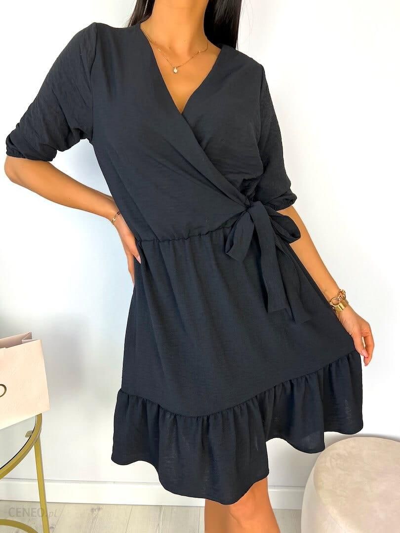 Czarna Sukienka z Kopertowym DekoltemKobieca sukienka – świetnie sprawdzi się zarówno w codziennych, jak i okazjonalnych stylizacjach. Kopertowy dekolt pięknie wyeksponuje szyję, a gumeczka wszyta w talii podkreśli atuty sylwetki. Jednolita kolorystyka pozwoli na wybór wielu dodatków do stylizacji. Subtelna falbanka na dole dodaje produktowi uroku. Sukienka będzie idealnym wyborem na spotkanie, imprezę czy też randkę.rozkloszowany fasondekolt kopertowyrękawy zakończone gumeczkągumka w talii (rozciąga się o ok. 30 cm)wszyty pasek w taliifalbanka na dolezarówno przód, jak i tył w tej samej kolorystycelekki, nierozciągliwy materiałrozmiary od 36 do 42produkt włoskiJak dobrać odpowiedni rozmiar?Przy wyborze rozmiaru proszę sugerować się wymiarami podanymi w poniższej tabeli. Produkty mierzone są na płasko bez rozciągania. Przy wyborze rozmiaru najlepiej porównać wymiary z tabeli do ubrań, które Państwo posiadają. Wymiary podane w tabeli mogą różnić się od wymiarów rzeczywistych produktu +/- 2cm.Tabela rozmiarów 771636(S)38(M)40(L)42(XL)Długość całkowita94 cm95 cm96 cm97 cmSzerokość w ramionach (od szwu do szwu)40 cm41 cm42 cm43 cmObwód w biuście100 cm104 cm108 cm112 cmObwód w talii62 cm64 cm66 cm68 cmObwód w biodrach110 cm114 cm118 cm122 cmObwód na dole190 cm194 cm198 cm202 cm