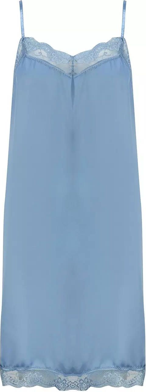 Bieliźniana sukienka miniWykonany z połyskującego materiałuWykończona szeroką koronką w tym samym kolorzeLuźny krójGłęboki dekolt z przodu i na plecachNa cienkich ramiączkach z regulacją