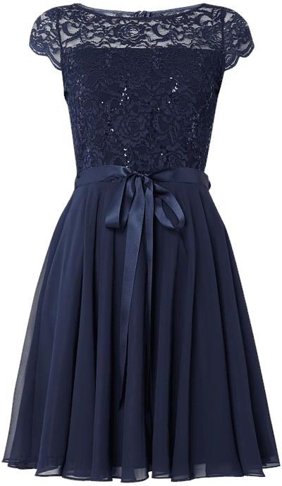 Sukienka koktajlowa damska SWING , Góra z kwiatowej koronki , Taliowany krój , Okrągły dekolt , Wszyty zamek błyskawiczny z tyłu , Krótkie rękawki z falistym wykończeniem , Cekinowe obszycie , Odznaczająca się, rozkloszowana spódnica z szyfonu , Pasek wiązany w talii , Nieprzejrzysta halka z prostokątnym dekoltem, Długość tyłu w rozmiarze 36: 91 cm