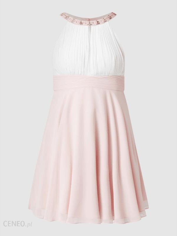 Sukienka koktajlowa damska Jake*s Cocktail, Szyfon , Taliowany krój, Dwa kolory, Dekolt halter z ozdobnymi perełkami i ozdobnymi kamieniami, Bez rękawów, Góra z wycięciem i plisami, Pasek w talii z marszczeniem, Rozkloszowana spódnica , Wszyty zamek błyskawiczny z tyłu, Lekka halka, Długość tyłu w rozmiarze 36: 84 cm