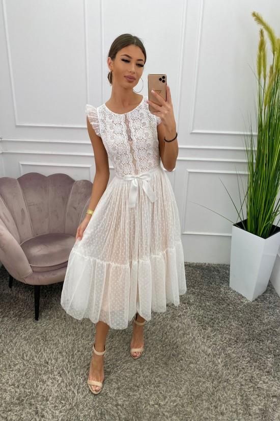 Elegancka sukienka midi w kolorze białym na beżowym podbiciu to świetna propozycja na ważne uroczystości. Świetnie sprawdzi się na przyjęciu weselnym, komunijnym, czy podczas innych ważnych rodzinnych spotkań. Góra sukienki wykonana z kobiecej koronki gipiurowej, dół luźny, tiulowy w kropki. Sukienka wykonana z wysokiej jakości materiału. Zapinana z tyłu na zamek. Produkt z importu.