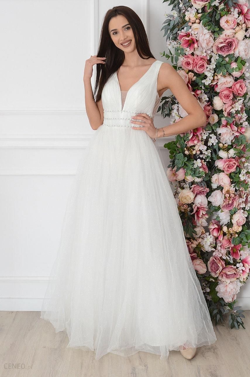 Sukienka maxi brokatowa z tiulem biała MedinaSukienka maxi brokatowa z tiulem biała. Ekskluzywna suknia ślubna uszyta z tiulu w pasie ozdobiona taśmą z cyrkoniami. Podwójny dekolt w kształcie litery V eksponuje linię ramion, szyi oraz łopatek. Robi niesamowite wrażenie w świetle lamp, wspaniale się błyszczy i zwraca uwagę. Model zapinany z tyłu na kryty zamek. Dół składa się z trzech warstw – podszewki oraz dwóch warstw tiulu – jednej pokrytej błyszczącymi drobinkami. Sukienka posiada wszyte miseczki.Suknia prezentuje się niesamowicie. Wspaniała i niepowtarzalna sukienka dla Panny Młodej oraz druhen.Modelka: wzrost 163 cm, rozmiar S.Sprawdź wymiary podane w tabeli, gdyż rozmiarówki różnią się od siebie. Wymiary mierzone na płasko.Wymiary w cm / RozmiarSMLdługość całkowita152152155szerokość pod pachami424446szerokość w pasie343638Skład:100% poliester
