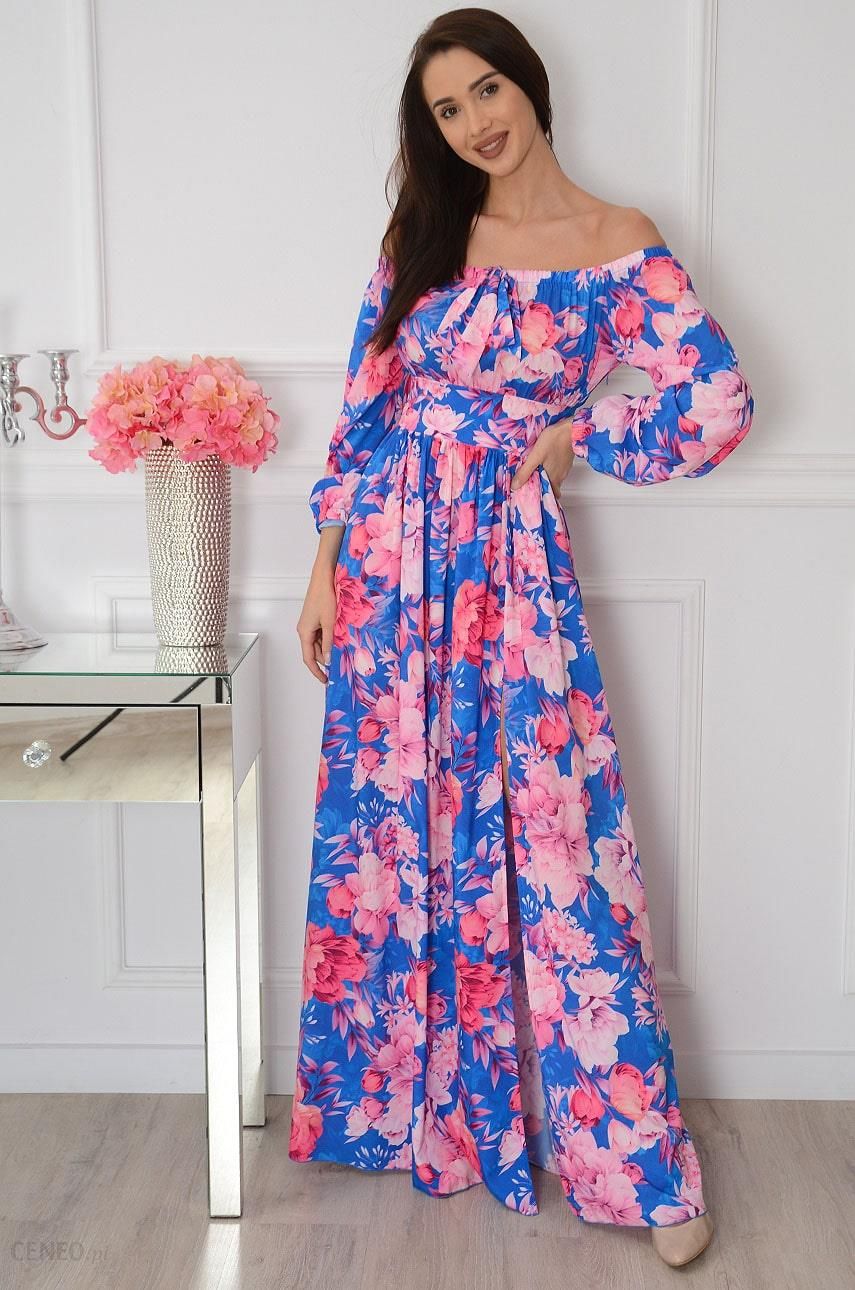 Sukienka maxi hiszpanka w różowe kwiaty kobalt AlisaSukienka maxi hiszpanka w różowe kwiaty kobalt. Zjawiskowa sukienka o długości maxi z rozkloszowanym dołem oraz z dekoltem opuszczanym na ramiona. Dekolt carmen podkreśla linię ramion i szyi dodając zmysłowości i lekkości. Sukienka posiada długie, poszerzane rękawy zakończone gumką oraz ozdobne wiązanie przy dekolcie. Zapinana z boku na kryty zamek. Z przodu posiada rozcięcie, które eksponuje zgrabne nogi. W pasie szerokie przeszycie podkreślające talię, które się nie rozciąga.Sukienka uszyta jest z delikatnego, zwiewnego materiału. Uniwersalny model, który można nosić latem na co dzień, a także na ślub, wesele oraz inne okazje.PRODUKT POLSKIModelka: wzrost 172 cm, biust 80 cm, talia 64 cm, biodra 83 cm, rozmiar S.Sprawdź wymiary podane w tabeli, gdyż rozmiarówki różnią się od siebie. Wymiary mierzone na płasko.Wymiary w cm / RozmiarXSSMLXLdługość całkowita142142143143145szerokość pod pachami38-4040-4242-4445-4747-49szerokość w pasie3235373941długość rękawa od ramienia5858586060długość rękawa od pachy4848485050Skład:100% poliester