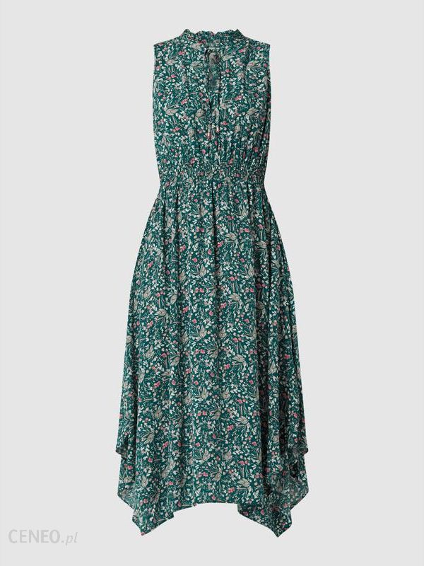 Sukienka midi damska Apricot, Czysta wiskoza , Taliowany krój bez rękawów , Kwiatowy wzór , Falbaniasta stójka, Wycięcie w kształcie łezki z wiązaniem, Marszczona wstawka w talii, Rozkloszowana spódnica z drobnymi marszczeniami, Asymetryczny dół , Długość tyłu w rozmiarze S: 120 cm