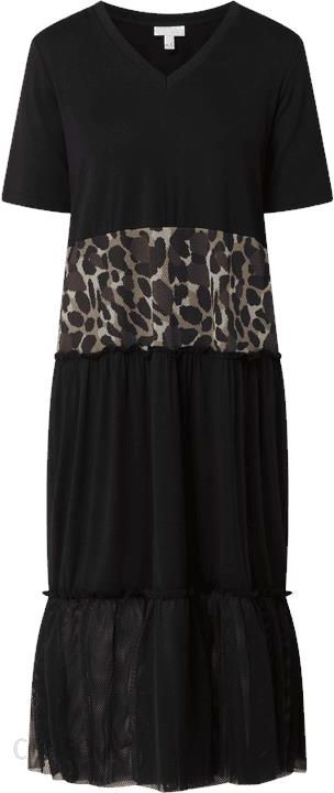 Sukienka midi damska SPORTALM, Mieszanka modalu i elastanu , Taliowany krój , Stopniowanie , Dekolt w serek , Krótkie rękawy , W talii wstawka w kontrastowym kolorze ze wzorem na całej powierzchni, Rozkloszowana spódnica z drobnymi marszczeniami, Dół obszyty falbaną z materiału w kontrastowym kolorze , Długość tyłu w rozmiarze 36: 116 cm