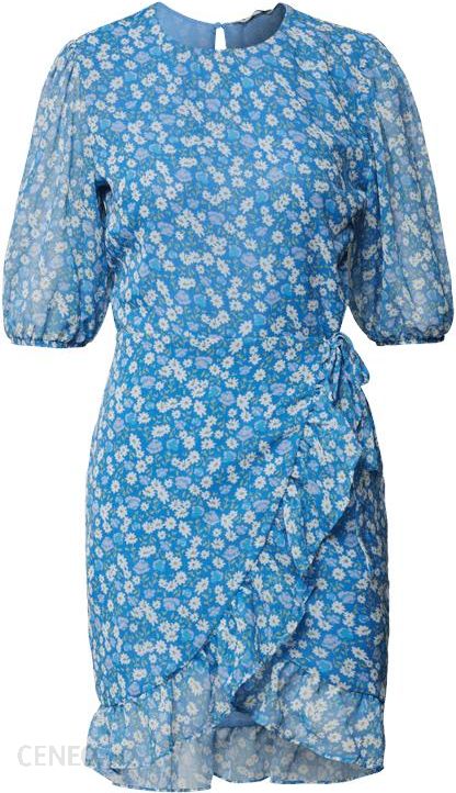 Sukienka mini damska NA-KD, Wytrzymały materiał, Taliowany krój, Kwiatowe wzory na całej powierzchni, Detal w stylu kopertowym, Wszyty zamek błyskawiczny, Elastyczne mankiety, Falbany, Okrągły dekolt, Wycięcie w kształcie łezki z tyłu, Rozkloszowana spódnica, Długość tyłu w rozmiarze 36: 90 cm, Szerokość klatki piersiowej w rozmiarze 36: 45 cm, Długość rękawa w rozmiarze 36: 36 cm