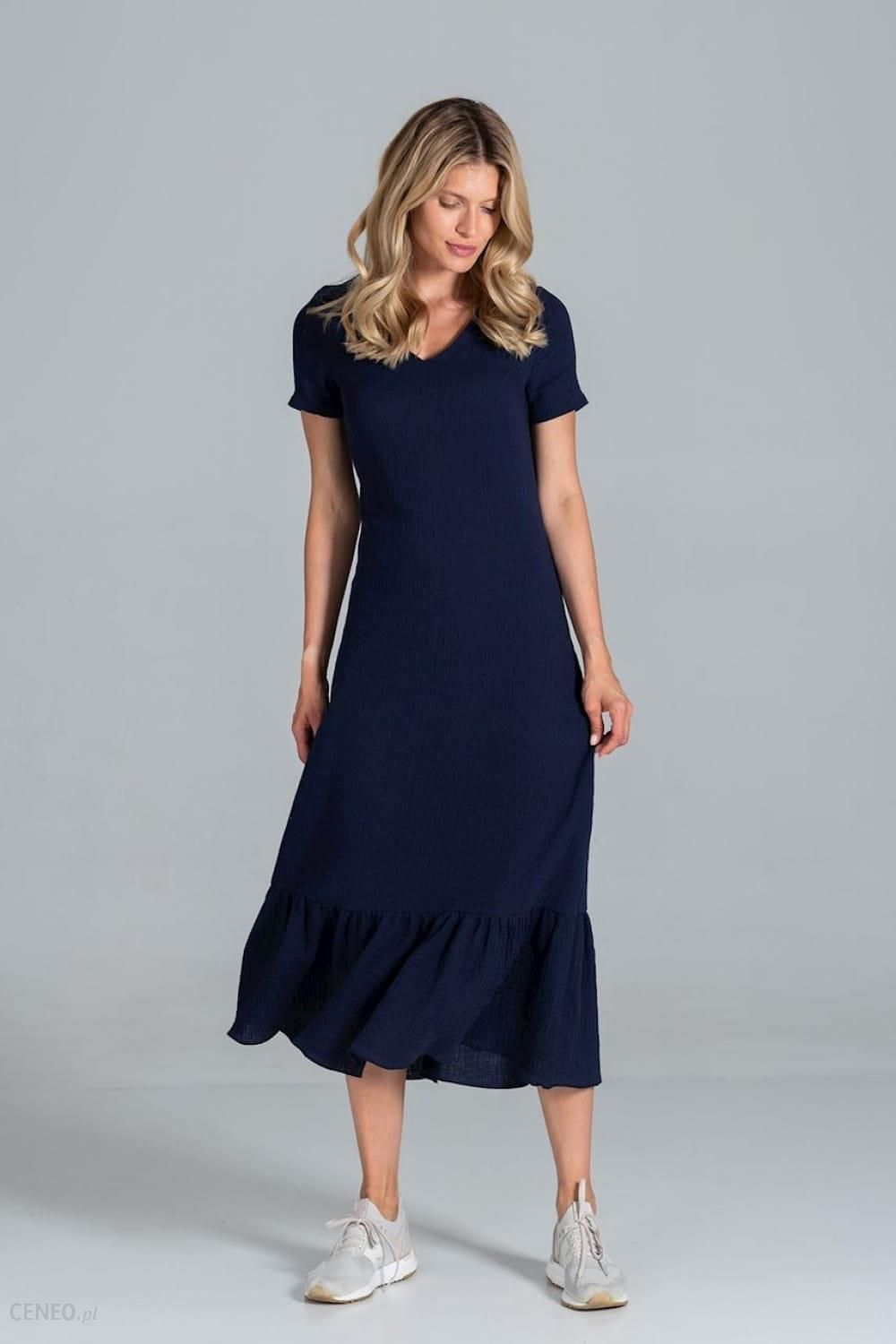 Sukienka midi z dekoltem w serek, z krótkim rękawem, lekko rozkloszowana do dołu, z falbaną. Bawełna 100 % RozmiarDługośćObwód w biodrachObwód w biuścieObwód w taliiL132 cm114 cm98 cm92 cmM131 cm110 cm94 cm88 cmS130 cm106 cm90 cm84 cmXL133 cm118 cm102 cm96 cm