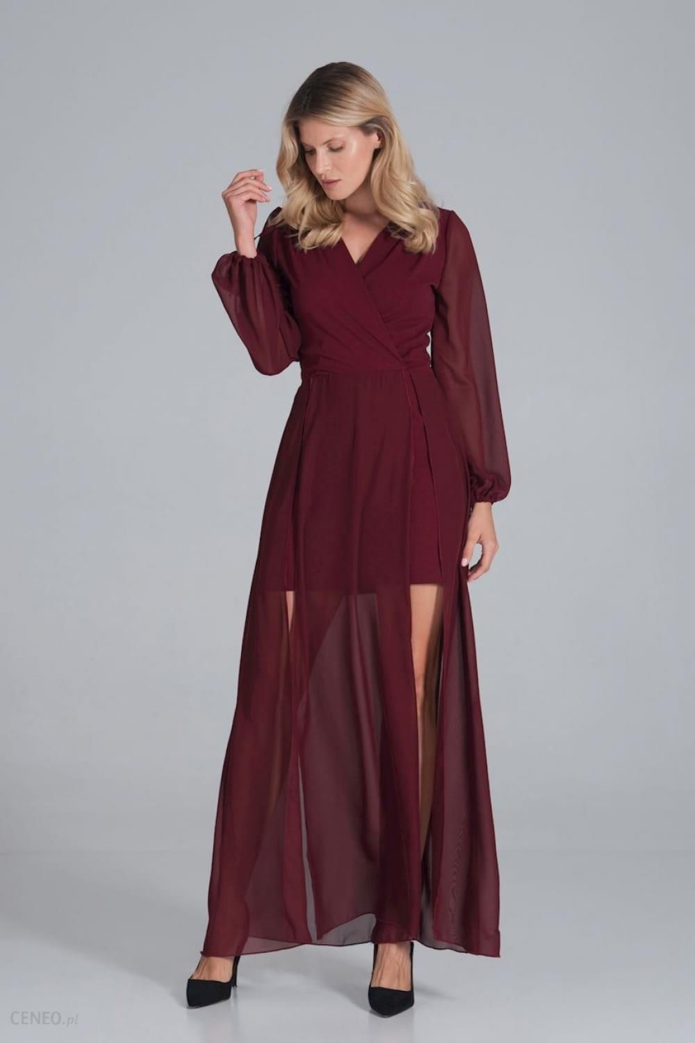 Koktajlowa sukienka maxi z dwóch gatunków tkanin. Kopertowy dekolt, długi szyfonowy rękaw z wiązaniem. Dwuwarstwowy dół. Spodnia część sukienki mini, wierzchnia warstwa maxi z szyfonu z rozcięciami z przodu. Elastan 5 % Polyester 95 % RozmiarDługośćObwód w biodrachObwód w biuścieObwód w taliiL147 cm108 cm98 cm80 cmM146 cm104 cm94 cm76 cmS145 cm100 cm90 cm72 cmXL148 cm112 cm102 cm84 cm