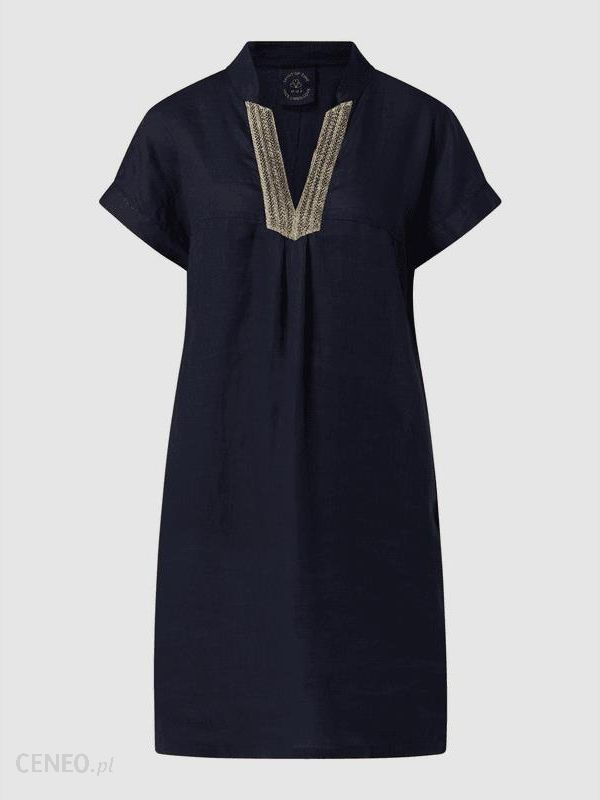 Sukienka damska Oui, Czysty len , Taliowany krój , Kołnierzyk z lamówką i ozdobną tasiemką, Krótkie, ukośnie skrojone rękawy , Wpuszczane kieszenie , Rozkloszowana spódnica , Długość tyłu w rozmiarze 36: 99 cm