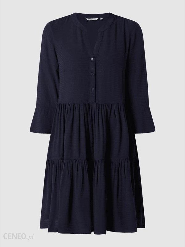 Sukienka damska TOM TAILOR Denim, Czysta wiskoza , Taliowany krój , Tkany wzór , Kołnierz z lamówką, Krótka listwa guzikowa , Rękaw o dł. 3/4 , Rozkloszowana spódnica z drobnymi marszczeniami, Dół obszyty falbaną , Długość tyłu w rozmiarze S: 93 cm
