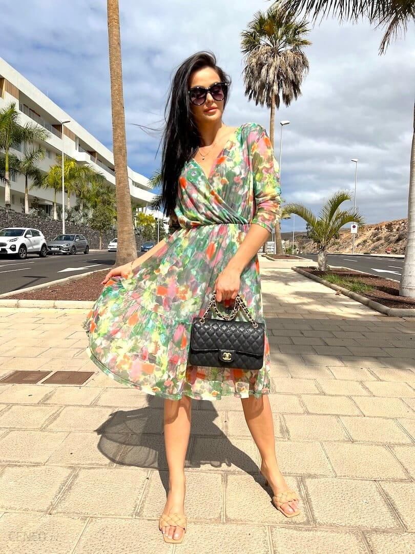 Zielona Sukienka z FalbankąElegancka sukienka midi, która będzie wspaniałym wyborem w wiosennym oraz letnim sezonie. Kopertowy, zakładany dekolt sprawia, że sukienka pięknie wyeksponuje biust oraz szyję. Lekko prześwitujące rękawy wykonane z siateczki sprawiają, że sukienka jest niezwykle wygodna i praktyczna. Wszyta gumka w pasie pięknie podkreśla atuty sylwetki. Falbanka na dole zdecydowanie dodaje uroku. Idealna propozycja na co dzień, ale też na wyjście ze znajomymi czy inną okazję.fason taliowanyrękawy 3/4kopertowy, zakładany dekoltmarszczenie z gumeczką na ramionachgumka (rozciąga się o ok. 30 cm)zarówno przód, jak i tył wzorzystyposiada podszewkęmateriał z siateczkirozmiary od 36 do 46produkt włoskiJak dobrać odpowiedni rozmiar?Przy wyborze rozmiaru proszę sugerować się wymiarami podanymi w poniższej tabeli. Produkty mierzone są na płasko bez rozciągania. Przy wyborze rozmiaru najlepiej porównać wymiary z tabeli do ubrań, które Państwo posiadają. Wymiary podane w tabeli mogą różnić się od wymiarów rzeczywistych produktu +/- 2cm.Tabela rozmiarów 770036(S)38(M)40(L)42(XL)44(2XL)46(3XL)Długość całkowita96 cm97 cm98 cm99 cm100 cm101 cmSzerokość w ramionach (od szwu do szwu)44 cm45 cm46 cm47 cm48 cm49 cmObwód w biuście96 cm100 cm104 cm108 cm112 cm116 cmObwód w talii60 cm62 cm63 cm64 cm65 cm66 cmObwód w biodrach130 cm134 cm138 cm142 cm146 cm150 cmObwód na dole200 cm204 cm208 cm212 cm216 cm220 cm